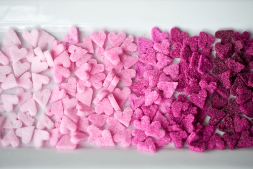 Aggiungere ½ tazza di zucchero alla miscela di zucchero colorato dal punto 2 per schiarirla. Mescolare accuratamente. Aggiungere 1 cucchiaino di albume d’uovo. Se il colore non viene raggiunto, continuare ad aggiungere ulteriori ½ tazze di zucchero e 1 cucchiaino di albume d’uovo , mescolando bene fino a quando si ottien il colore desiderato . Ripetere la fase 2. Continuare con i passaggi 2 e 3 fino a raggiungere la tonalità desiderata e il numero di cuori di zucchero che si necessitano. Si consiglia almeno 3-5 sfumature.