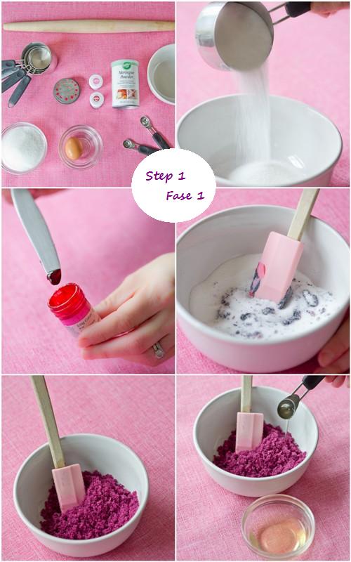 Aggiungere di più se è necessario, fino a quando si ottiene il colore desiderato. Aggiungere 1 cucchiaino di albume d’uovo e mescolare bene fino a quando il composto assomiglia a sabbia bagnata. Fare attenzione a non aggiungere troppo liquido o si sciogliere lo zucchero.