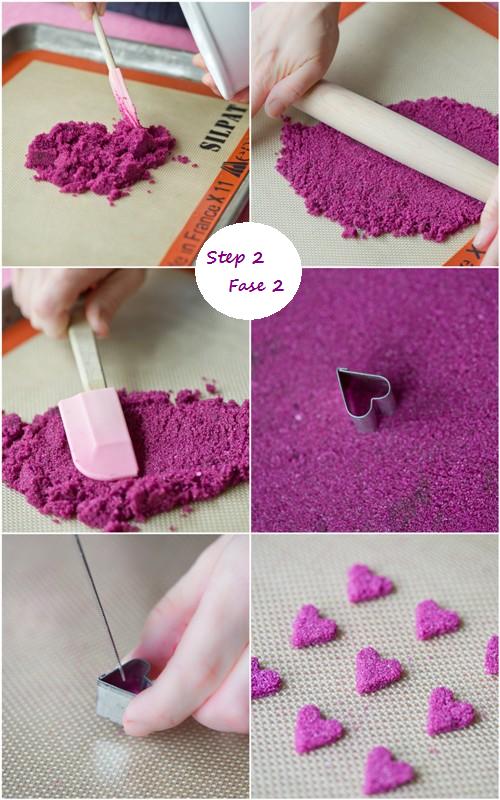 Riscaldate il forno a una temperatura di 200°. Cuocete i cuori per 10 minuti. Lasciarli indurire tutta la notte. I cuori di zucchero avranno la consistenza di una zolletta di zucchero.
