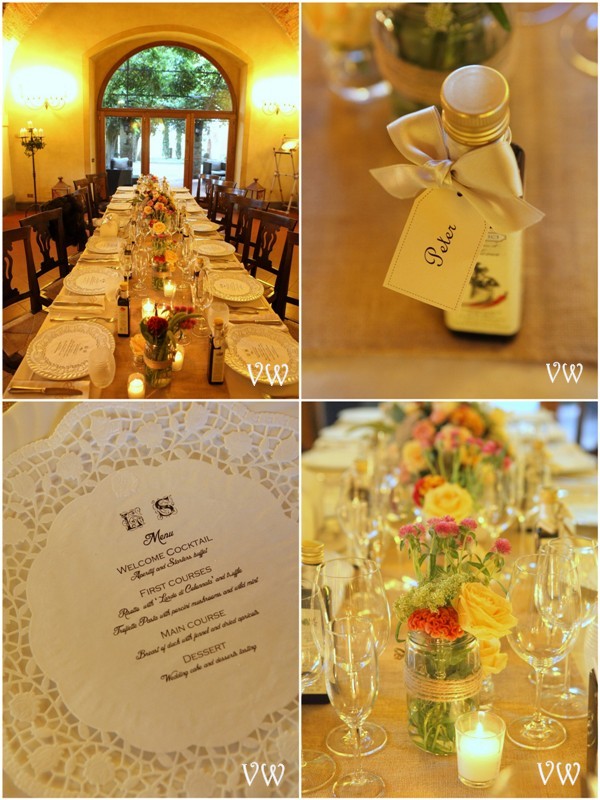 On the reception table we used a burlap runner and mixed jars and small wine carafes with spray roses, peonies, berries and herbs and a wine box centepiece. For the guests : doily menus to remember the delicious italian food and small olive oil bottles for taking home a piece of Tuscany.